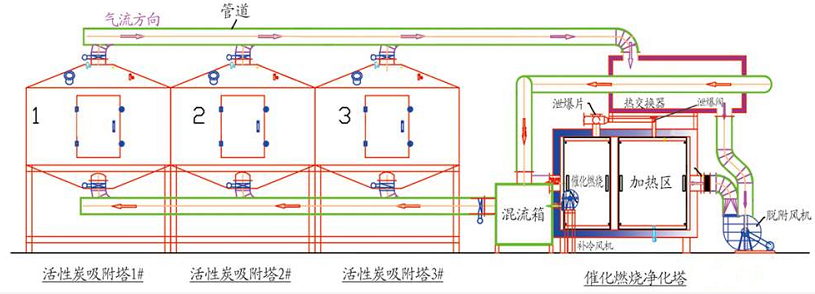 本設(shè)備是根據(jù)吸附(效率高)和催化燃燒(節(jié)能)兩個基本原理設(shè)計的,即吸附濃縮—催化燃燒法。包括三部分干式除塵、吸附氣體流程、脫附氣體流程: